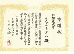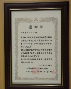 【2015年6月16日 由三菱自动车工业株式会社颁发的感谢状】