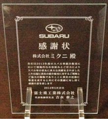【2015年5月13日 由斯巴魯颁发的感谢状和盾】