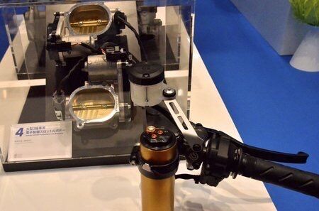 展示は、フューエルインジェクションシステムの関連コンポーネンツが中心。興味深いのはバイクの右側ハンドル・アクセルグリップを捻ることで、スロットルボアが開閉する様子が目の当たりにできる大型2輪車用電子制御スロットルボディのデモ機。