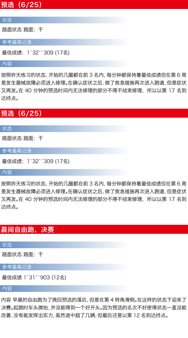 和预赛不同,地面问题上升至将近20度。出发还挺成功的,以14名的位置通过了起点线。每圈都和前面的车缩短车距,到了第11圈的时候上升到了第10名。赛程后半的第17 圈同时超越了2台车,排名升至第8。22圈长赛道的时候,轮胎的抓力开始下降,0.4秒内3台车展开了激烈的竞争,差点接近第2位。在有车辆跌倒的情况下,集中注意力最终以第5名的成绩通过终点线。