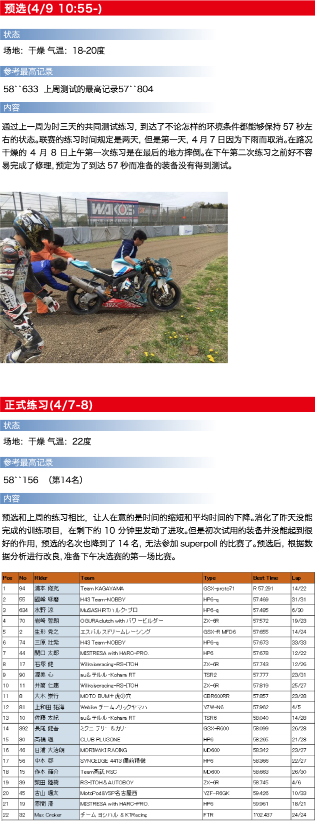 上午的第一圈是在潮湿的路面上行走,同时确认了追加的各种传感类的操作状况等。从厂商共同测试到底盘规格的更改及坐姿(重心位置)等方面的改善,虽然时间上还有可以缩短的空间,最终的排位结果是第3名。