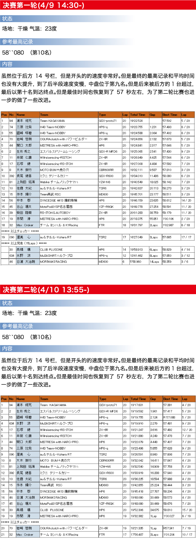 前一天由于没能很好的完成最佳的区间成绩,底盘的调整被控制在了最小限度,注意刹车和姿势,增加圈数。渐渐的区间成绩提高了,相比去年提高了1.3秒,刷新了个人的最好纪录,但很可惜最终成绩是17名。但是整体节奏在朝着好的方向调整了,明天的决赛争取可以获得好成绩。